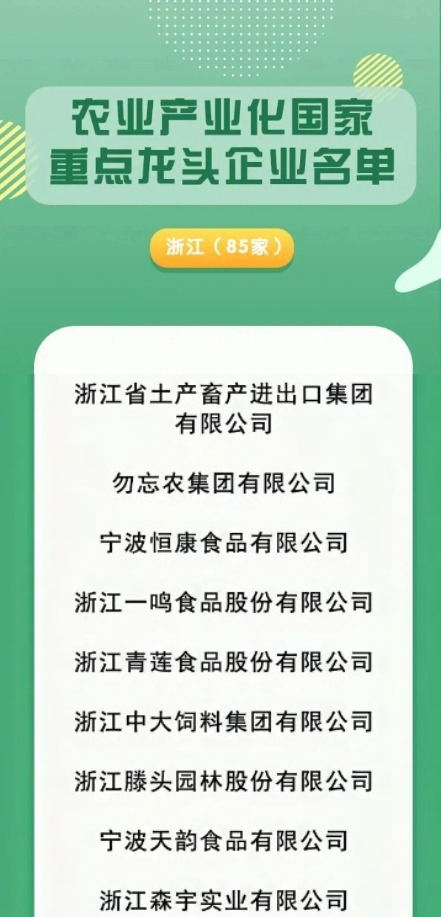 近日,農業農村部官網公布了農業產業化國家重點龍頭企業名單,全國共有2250家企業成功入圍。其中,浙江85家,浙江省土產畜產進出口集團有限公司在列。