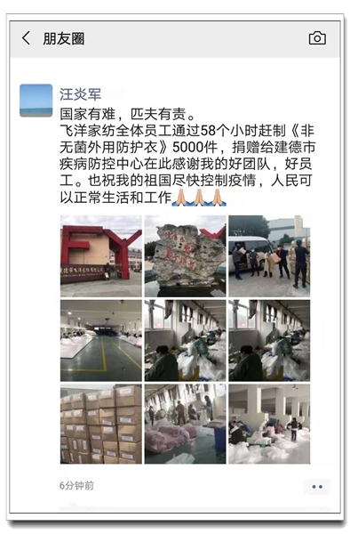 除了給我們加油鼓氣的韓國供貨商,業務十一部的國內生產企業同樣讓人肅然起敬。建德飛洋家紡汪炎軍總經理在春節假期還未結束的時候,就緊急召回所有本地員工,在58小時內趕制出5000件“非無菌外用防護衣”捐贈給建德市疾病防控中心。無論是飛洋家紡充滿社會責任感的慷慨老板,還是不計報酬、不辭辛苦的普通工人,無不讓人動容感懷,一句“國家有難,匹夫有責?!辈唤屓虽粶I下。